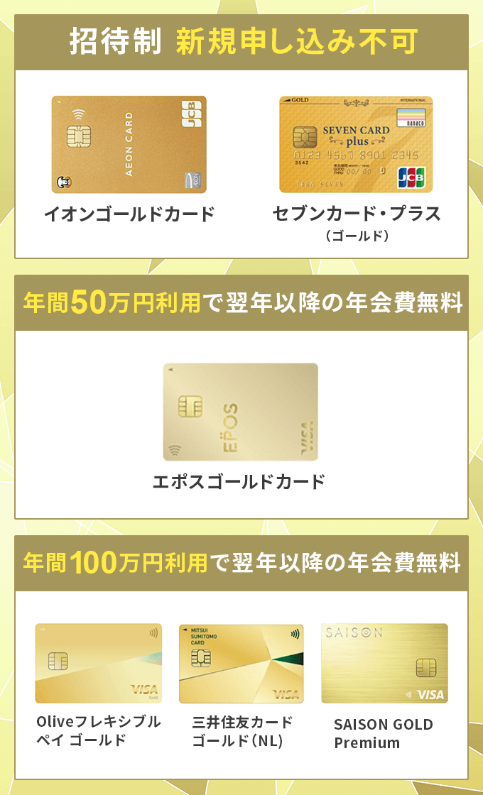 なかには、招待状(インビテーション)が来れば年会費無料で持てるゴールドカードや、年間の利用金額などの条件を達成すれば翌年度以降の年会費が無料になるゴールドカードも存在します。