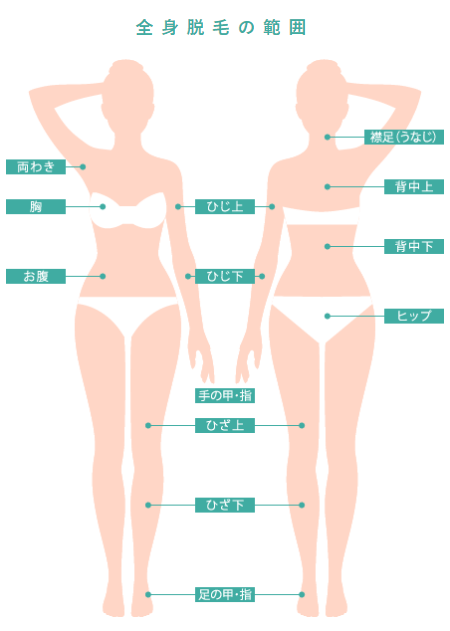 | 全身 | 両ワキ・胸・乳輪・お腹・ひじ上・ひじ下・手甲・手指・ひざ上・ひざ下・足甲・足指・うなじ・背中上・背中下・ヒップ |