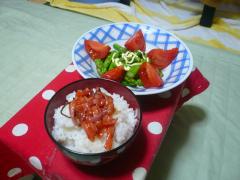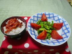 今日の夕食は、イカ明太子のせご飯とアスパラガスとトマトのサラダで美味しくいただきました。