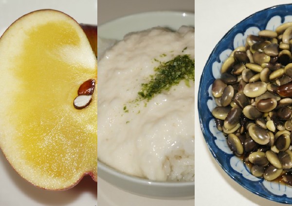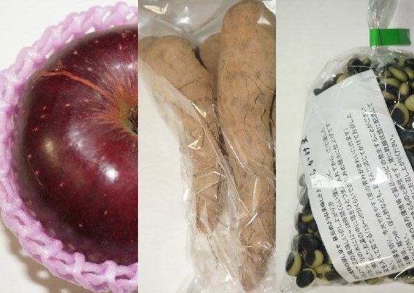 りんごは「こうみつ」、芋は掘りたて「山の芋」、豆は「くらかけ豆」