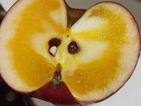 「こうみつ」といわれるスターキングの種から生まれためずらしい黒いりんごですが、写真を見ていただけるとわかると思いますが蜜がすごい!!!今まで食べたリンゴには、蜜はたまに入ってるかな~?程度でしたが、こんなに蜜が見えるリンゴは初めてです。パイナップルに似た食感とはよく言ったもので、本当にジューシーで甘いリンゴでした。