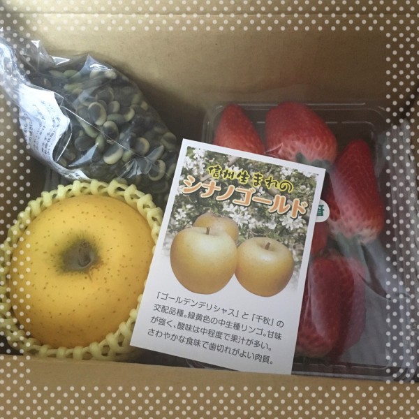 おまかせリンゴ1玉は、信州生まれのシナノゴールドでした。 シナノゴールド、あきひめイチゴ、くらかけ...