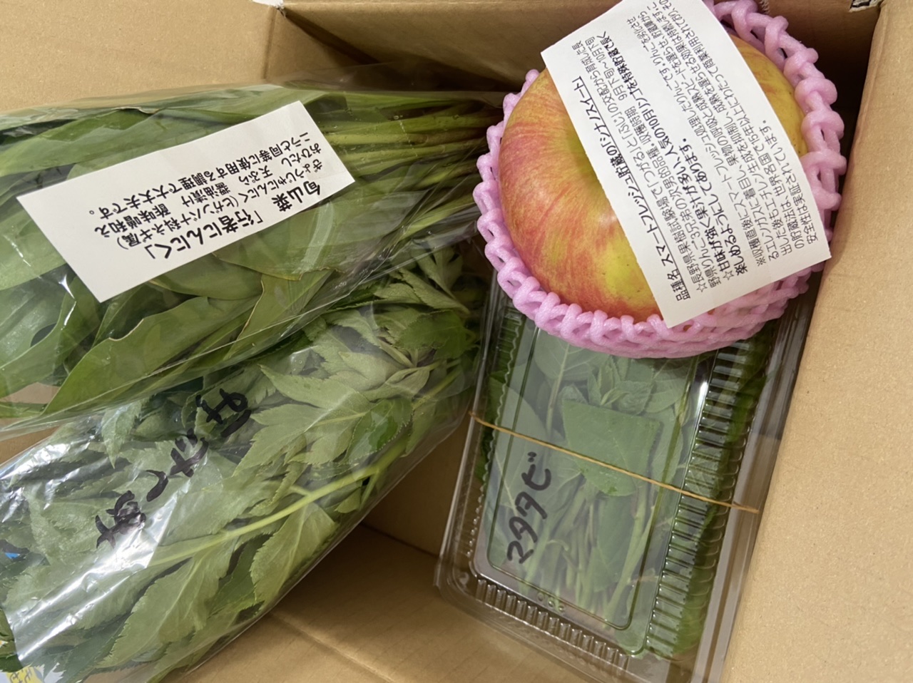 中にはお勧め山菜の「行者にんにく」「アシタバ」「マタタビ」の3種と、スマートフレッシュ貯蔵のシナノスイートが入っていました。