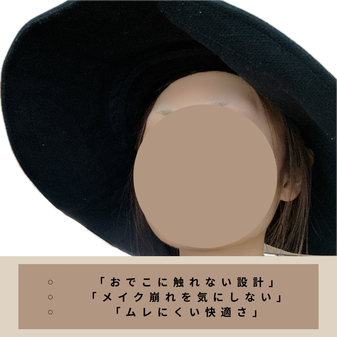 Step Cappelloは、その名の通り「おでこに付かない」構造が特徴です。特許も取得しているとのこと。ツバがおでこに触れない設計なので、ファンデーションが付く心配がありません。また、被った時に顔とツバの間に空間ができます。これがムレにくさにつながり、涼しく感じられます。長時間被っていても、不快感が少ないです。
