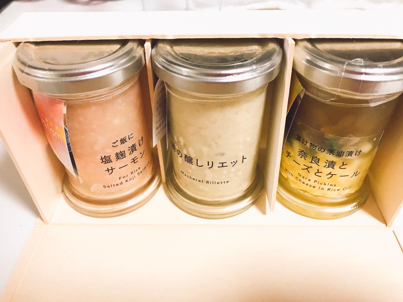 塩麹漬けサーモン、鯖のリエット、奈良漬けとチーズの3種類。小さくて、お洒落な瓶詰めに入っています。