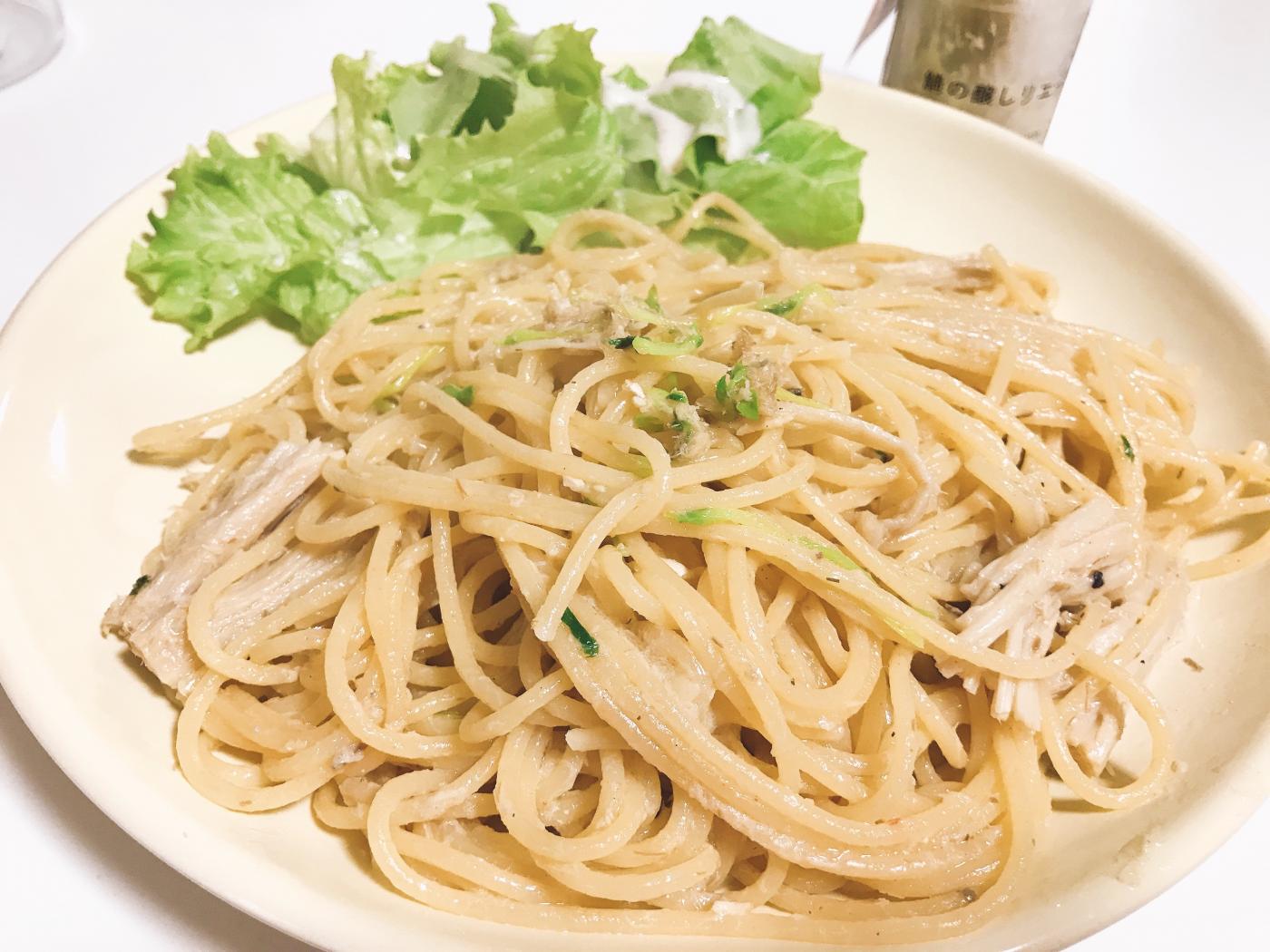 茹でたパスタにオリーブオイルと鯖のリエットを絡めるだけで完成。