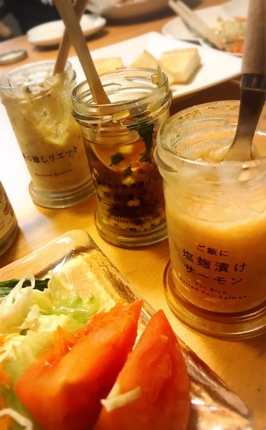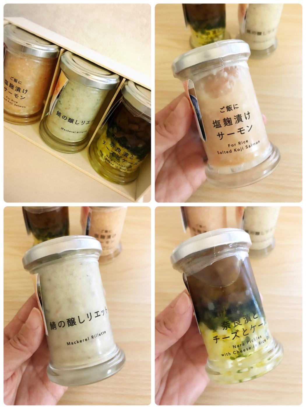 塩麹漬けサーモン、鯖のリエット、奈良漬けとチーズの3種類。小さくて、お洒落な瓶詰めに入っています。...