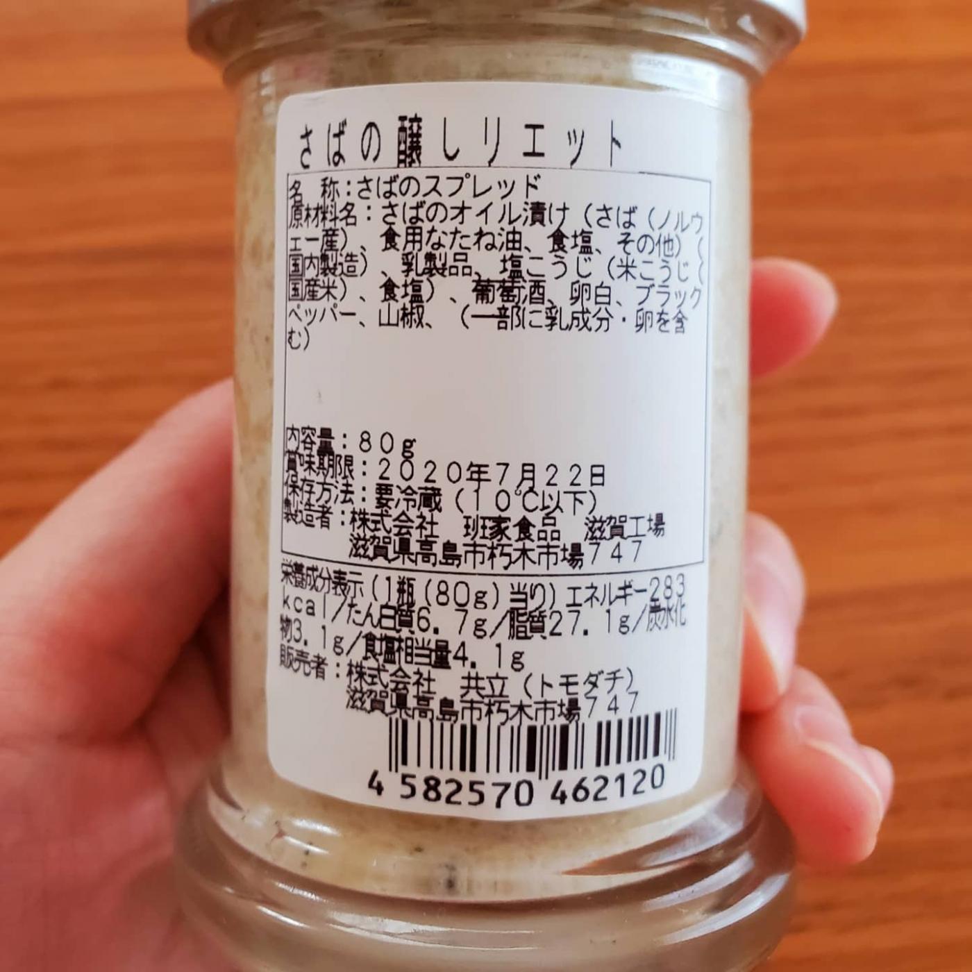 鯖と塩麹のリエットの瓶詰め。 体に優しい健康的な素材なのが嬉しい。 そのまま、バゲットなどのパン...