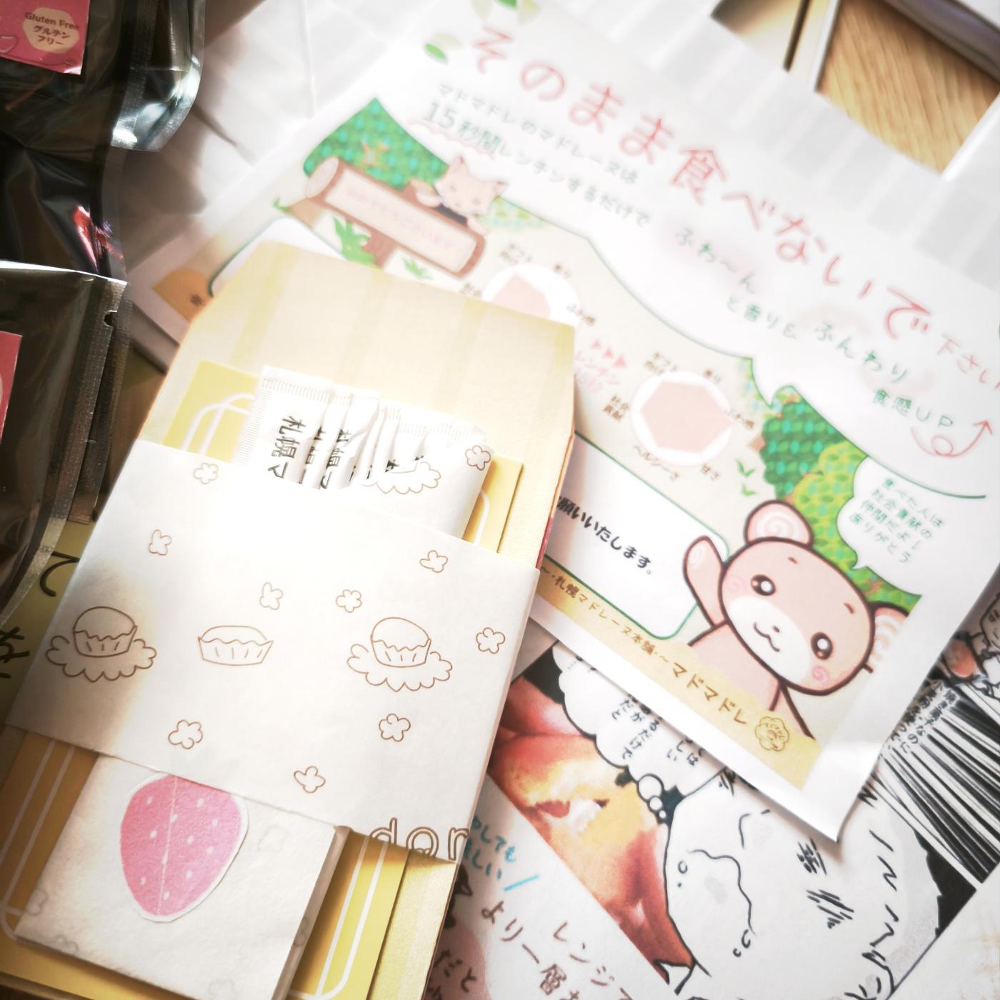 先ずはマドレーヌの他に、手提げ袋や食べ方の説明、ポチ袋、つまようじなど、色々同封されていて嬉しい驚きでした✨(ポチ袋は子供達に奪われましたが…🥹)