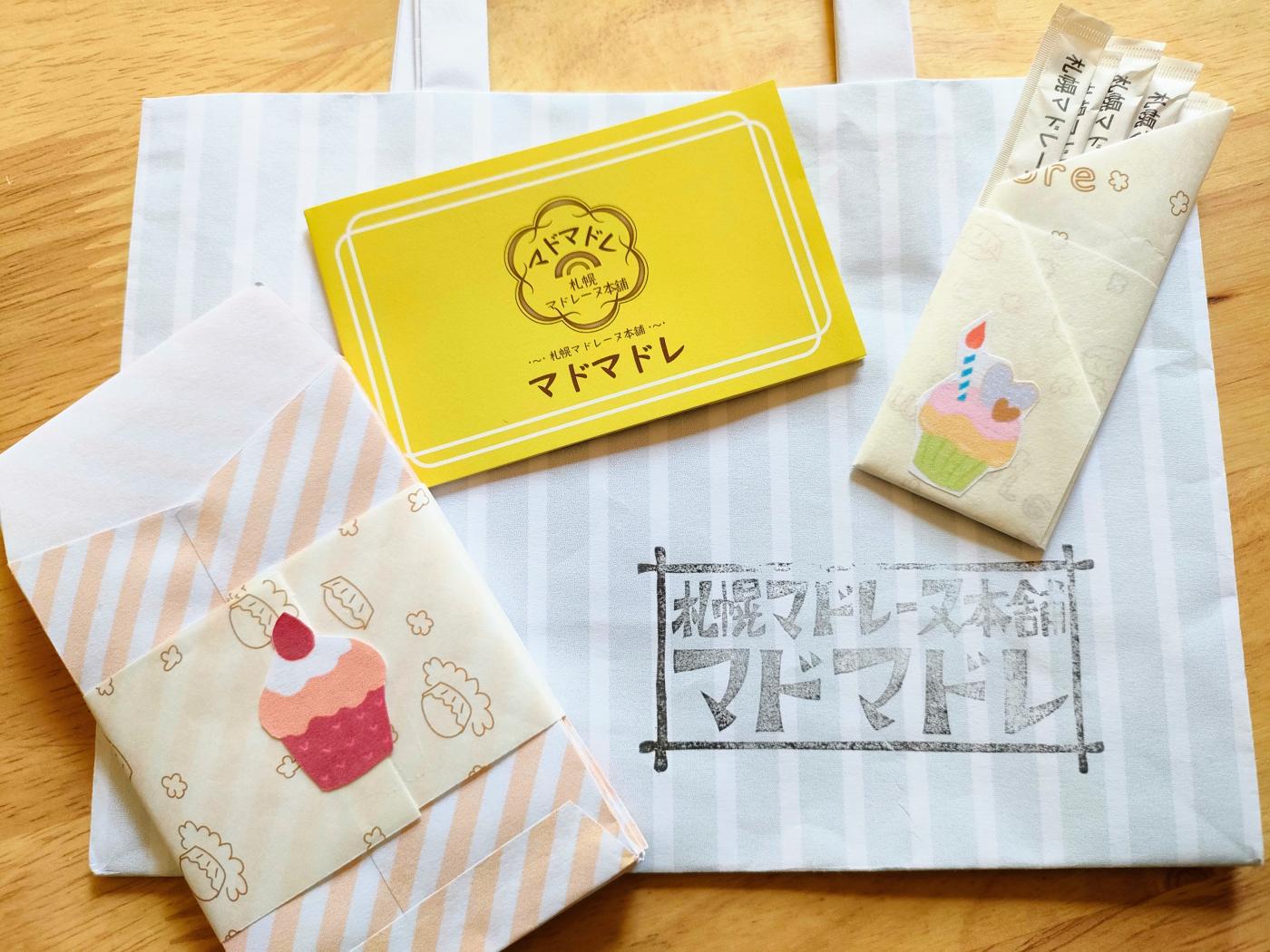 届いたBOXを開けてみると、マドレーヌ3個に加えて、可愛いポチ袋や楊枝、手提げ袋などが入っていて嬉しい驚き!!