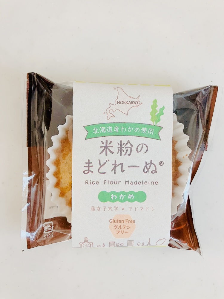 原材料の米粉は、自社製粉した北海道産ゆめぴりか100%米粉を使用、バター・砂糖・牛乳・蜂蜜・タマゴ、わかめも北海道産を100%使用し、北海道のおいしいが詰まったマドレーヌなんだって♪