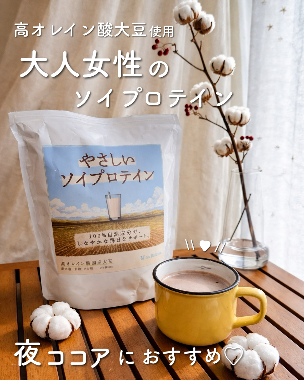 ミナバランス やさしいソイプロテインは、佐賀県産の高オレイン酸大豆を100パーセント使っていて人工的な添加物を一切使わず、自然の恵みをそのまま配合されているの!!ᵔ. ̫.ᵔ