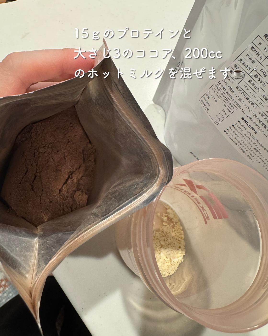 飲み方は、15gのプロテインとココア大さじ2〜3をホットミルクに混ぜます。