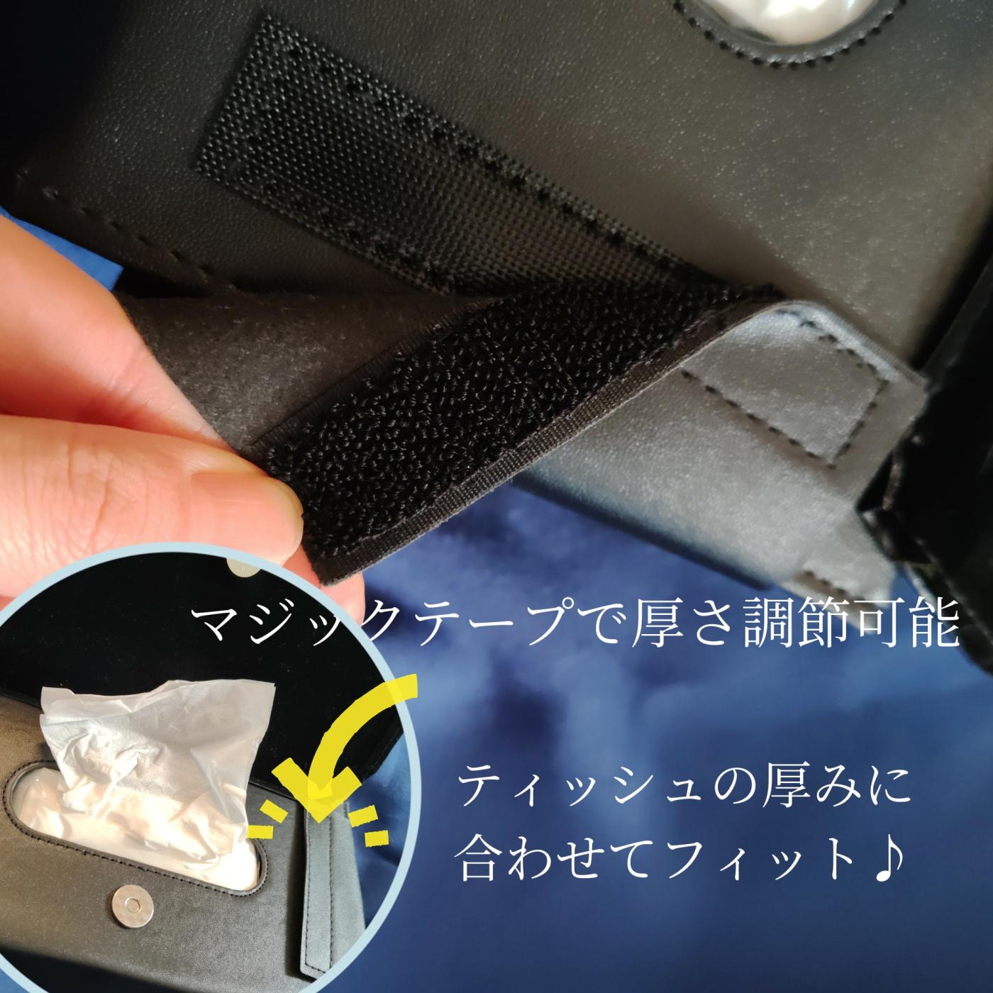 両サイドにはマジックテープが付いており、ティッシュボックスの厚さに合わせて自由に調節できるため、通常サイズのボックスからスリムタイプまで問題なく使用できました。