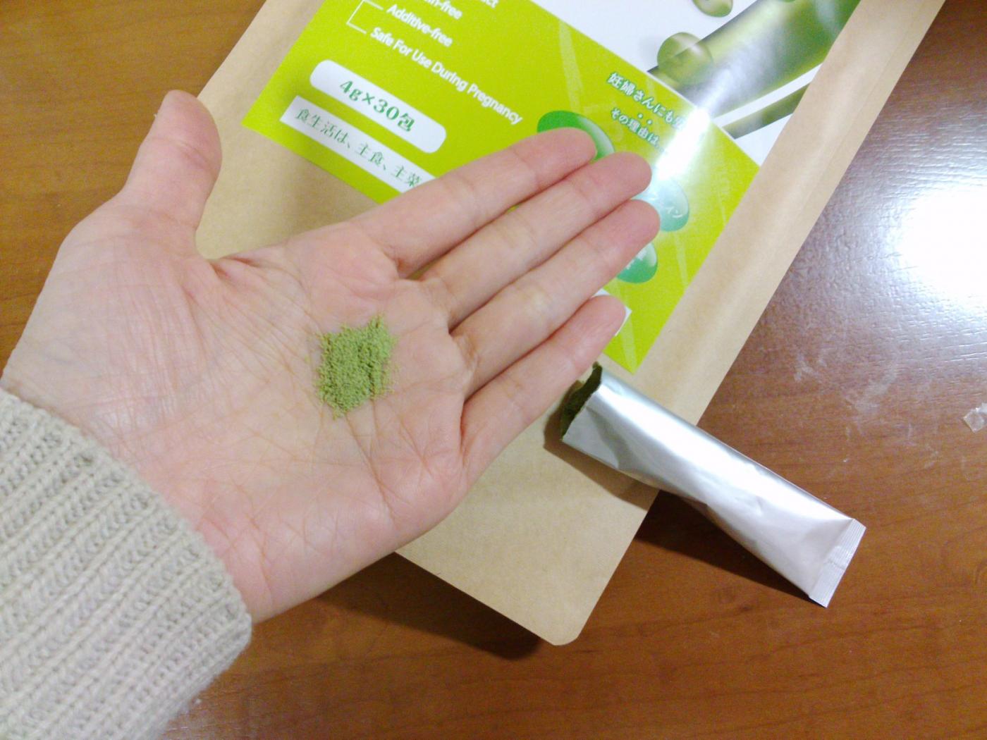 お水またはお湯150~200mlを混ぜるだけで簡単です。水やお湯だけでなく、牛乳や豆乳に溶かすのもおすすめ。私は150mlの水にオリゴ糖を混ぜて飲むのが好きです。お茶というか青汁のような緑の香りがします。独特の苦みや飲みにくさはなく、抹茶のようで飲みやすい味わいです。少し粘りがあって美味しいです。