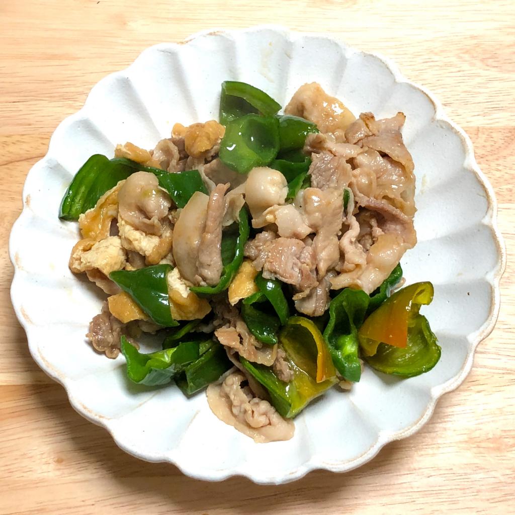 ピーマンと油揚げと豚バラ薄切り肉という、冷蔵庫の残り物を炒めた一品も、味どうらくの里を少しだけ薄めて味付けするだけ。