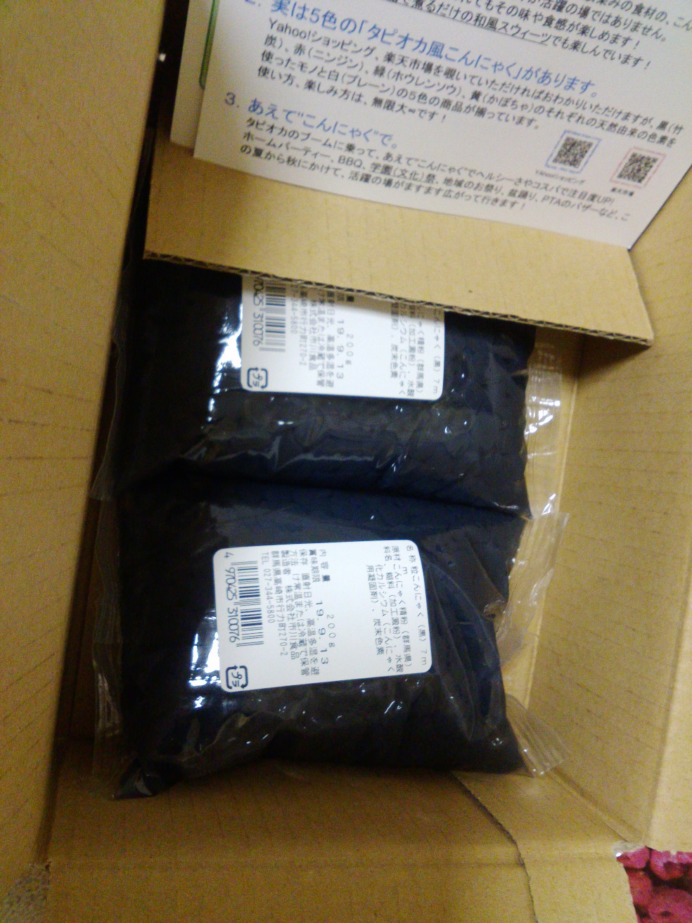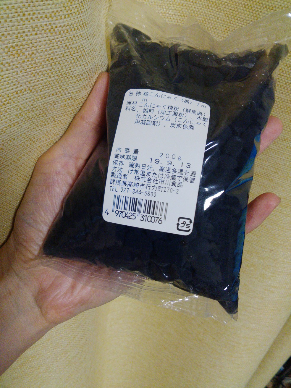 こんにゃくが特殊な技法で7mmの粒になっています。竹炭で黒色に着色してあって、見た目はタピオカです。