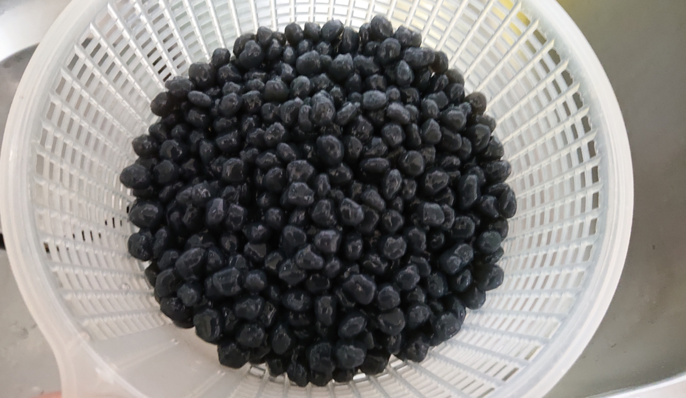こちらは竹炭で黒くした粒こんにゃくで、こんにゃくの仕込みの段階で竹炭のパウダーを混ぜ込んで黒い色を出しています