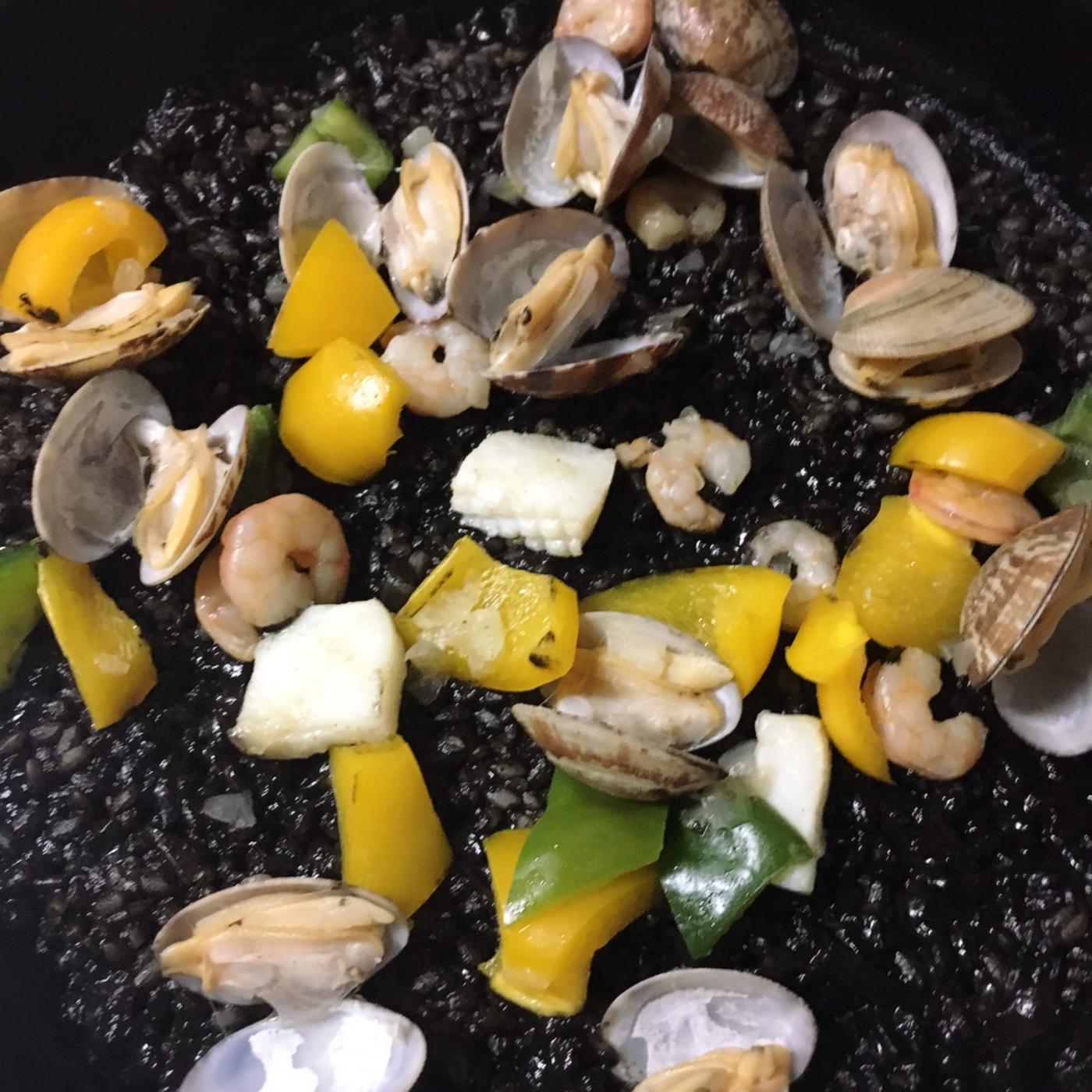 その後は水分が少なくなってきたら少し蒸らして具材をトッピングして、イカスミパエリアの出来上がり!!
