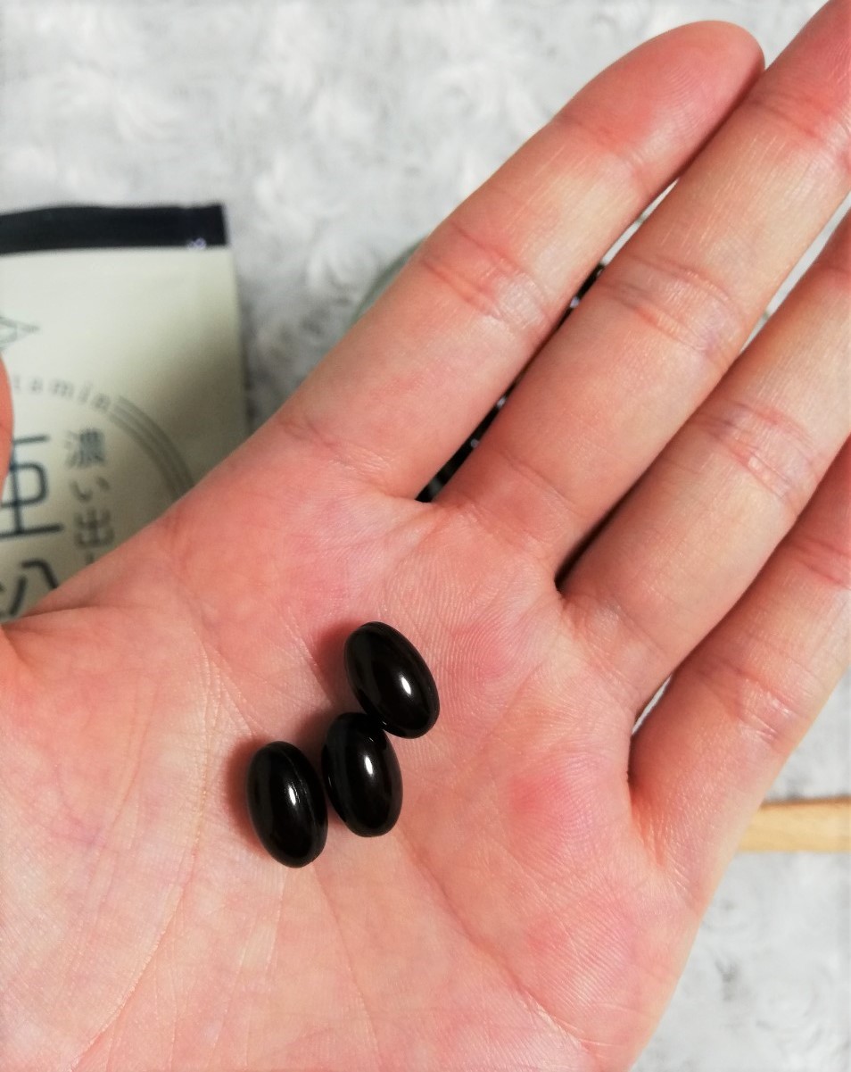 サプリメントは濃い茶色~紫色をしたカプセルタイプで、目安は1日3粒。