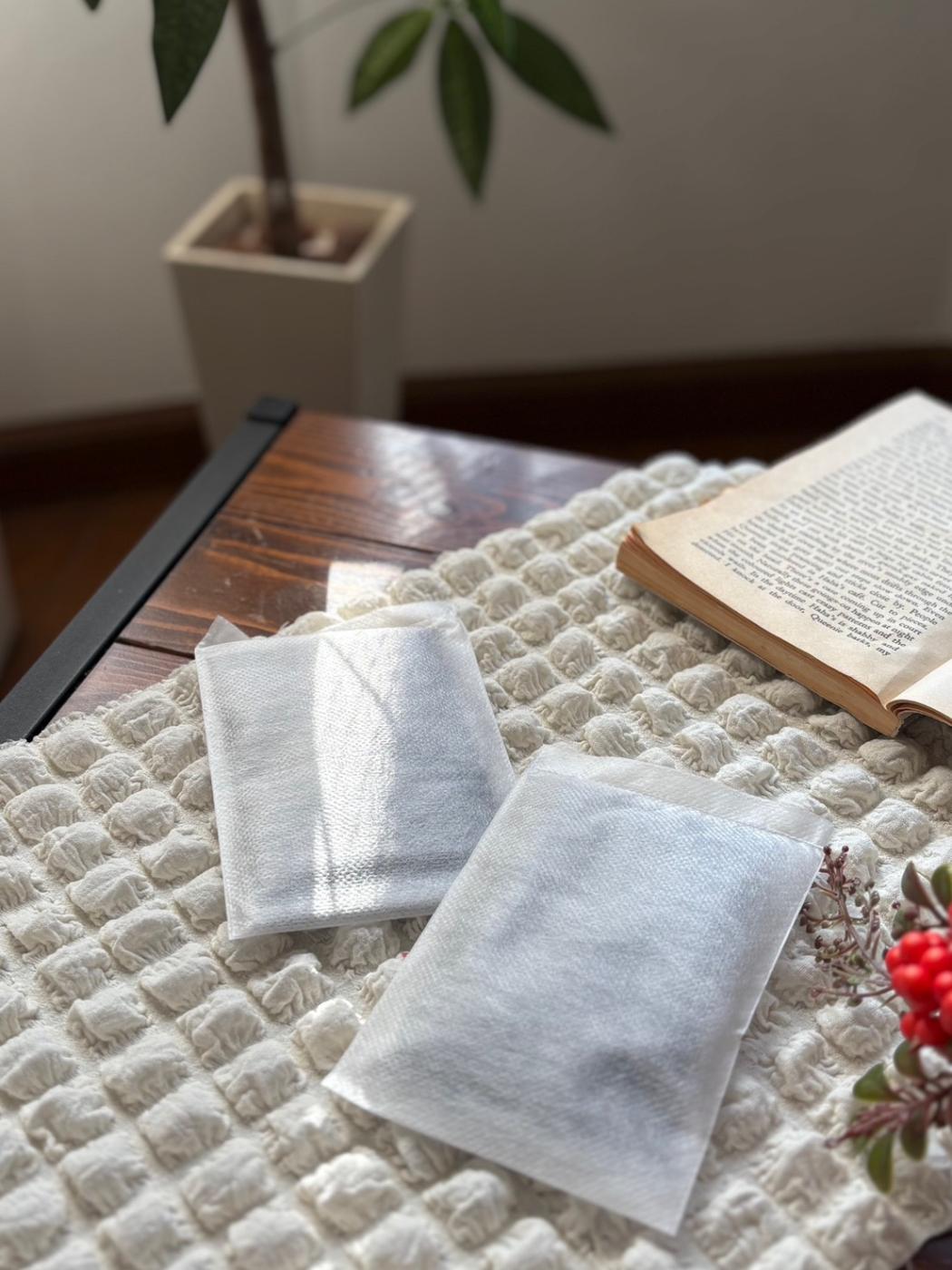 白い不織布の袋の中に竹炭が入っています。軽くて扱いやすいです☺️持ち歩きもしやすいです!