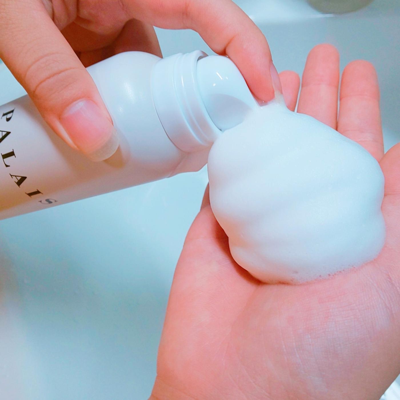 ぬるま湯で3分ほど予洗いをしてから【炭酸シャンプー PALAIS】をよく振って、ボトルを立てた状態でピンポン玉3個分くらいの泡を手に取る☑️