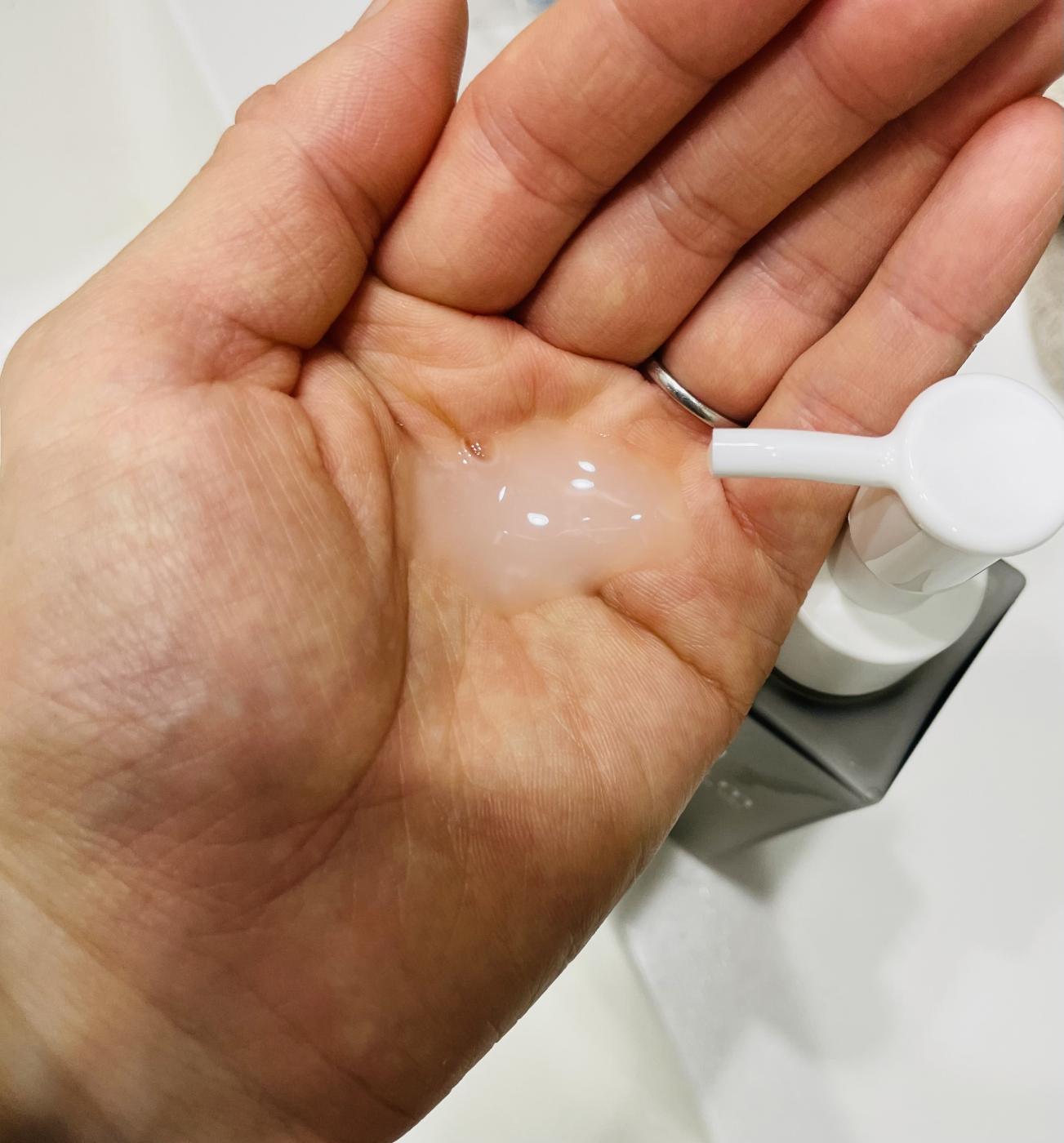 ワンプッシュすると、乳白色のジェルが出ています。ワンプッシュだと少ないと思えますが、伸びがいいので十分潤います。手のひらに広げて、顔にササっと広げるだけ。1日2回の利用で約2ヶ月使用可能というのも納得です。コスパが良いですね。