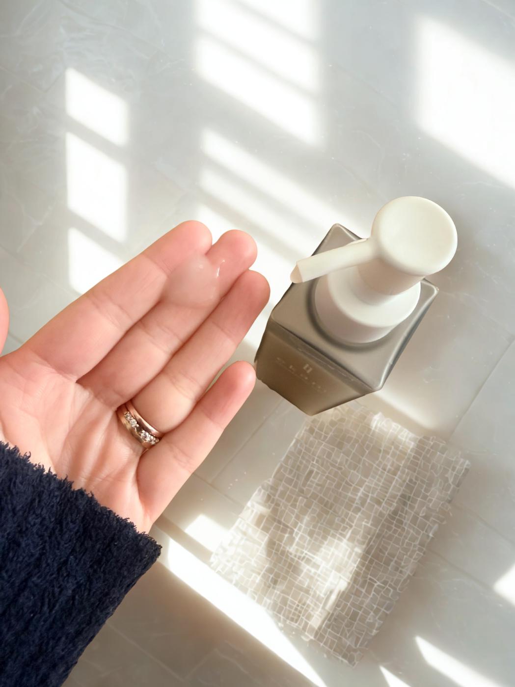 ジェルはみずみずしいテクスチャーで、ベタつきが少なく肌にすっとなじむ印象。夫も「重たくないから使いやすい」と言っていました。普段は化粧水だけなので、使用後は肌がいつもよりしっとりして、触った感じが違うのが分かりました。時間が経っても乾燥しにくく、カサつきがちな部分も落ち着いているように感じます。