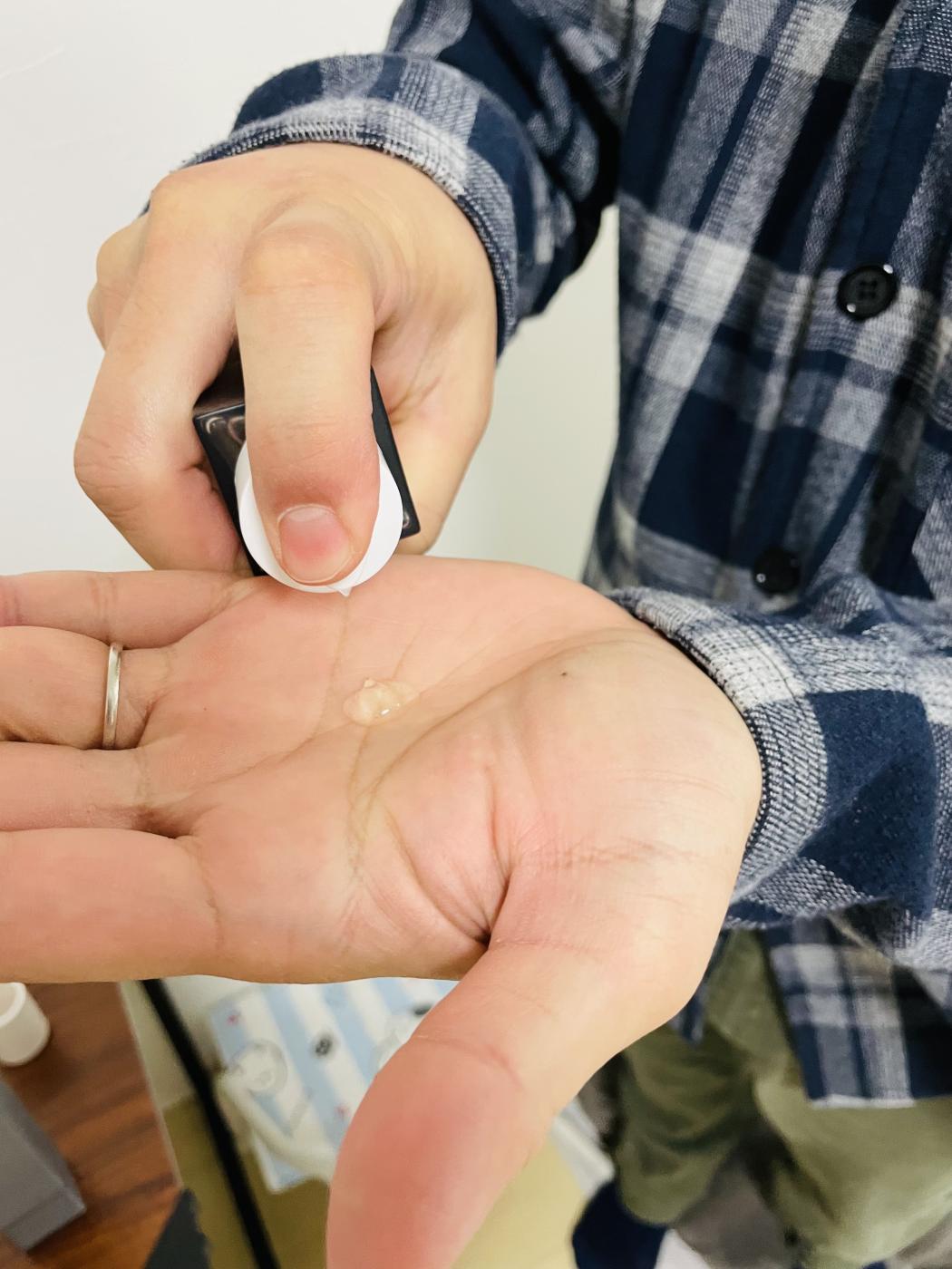 ボトルはプッシュ式。出すぎることもなく、こぼれることもなく使いやすい作りです。手のひらに出してみると透明のジェル状の液体が出てきます。1プッシュだと少ないかなと思いましたが、伸びが良いので顔全体に行き渡りました。乾燥の強い時期は、もう1プッシュプラスしても良さそうです。