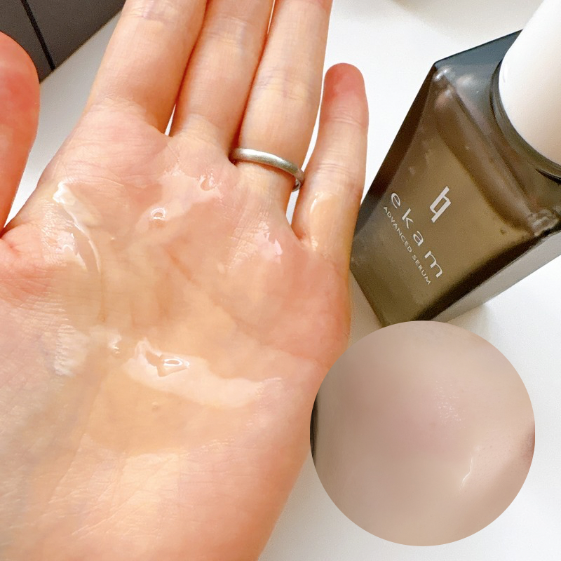 手に出してみると、透明で少しとろみのある贅沢なテクスチャーです。肌にのせると驚くほどなめらかに伸び広がり、吸い付くようにスッとなじみます。ベタつきがほとんどないので、朝のメイク前でもヨレを気にせず使えるのが嬉しいです。