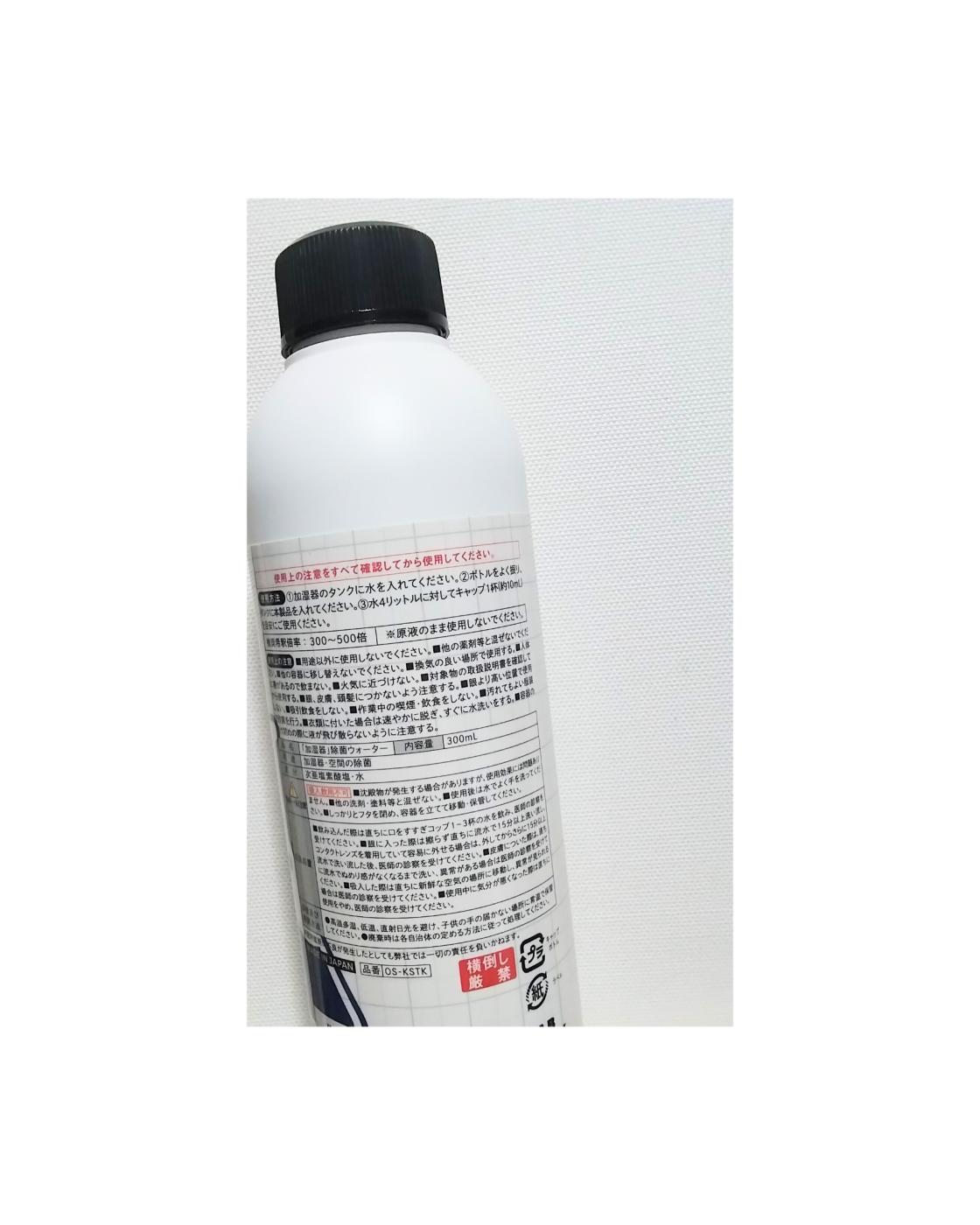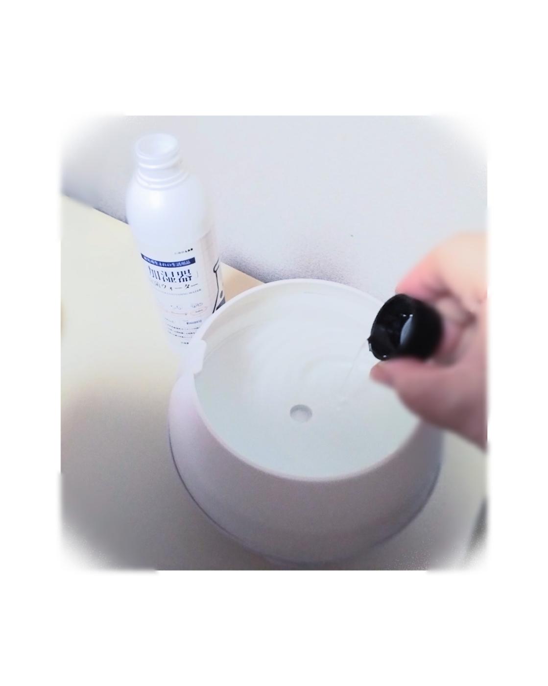 面倒な手間とかは特になくて、水をいれた加湿器のタンク内に投入するだけという手軽さが嬉しい。目安は 水4リットルに対してキャップ1杯分(約10ml)だそうです[推奨希釈倍率は300~500倍だそうです]
