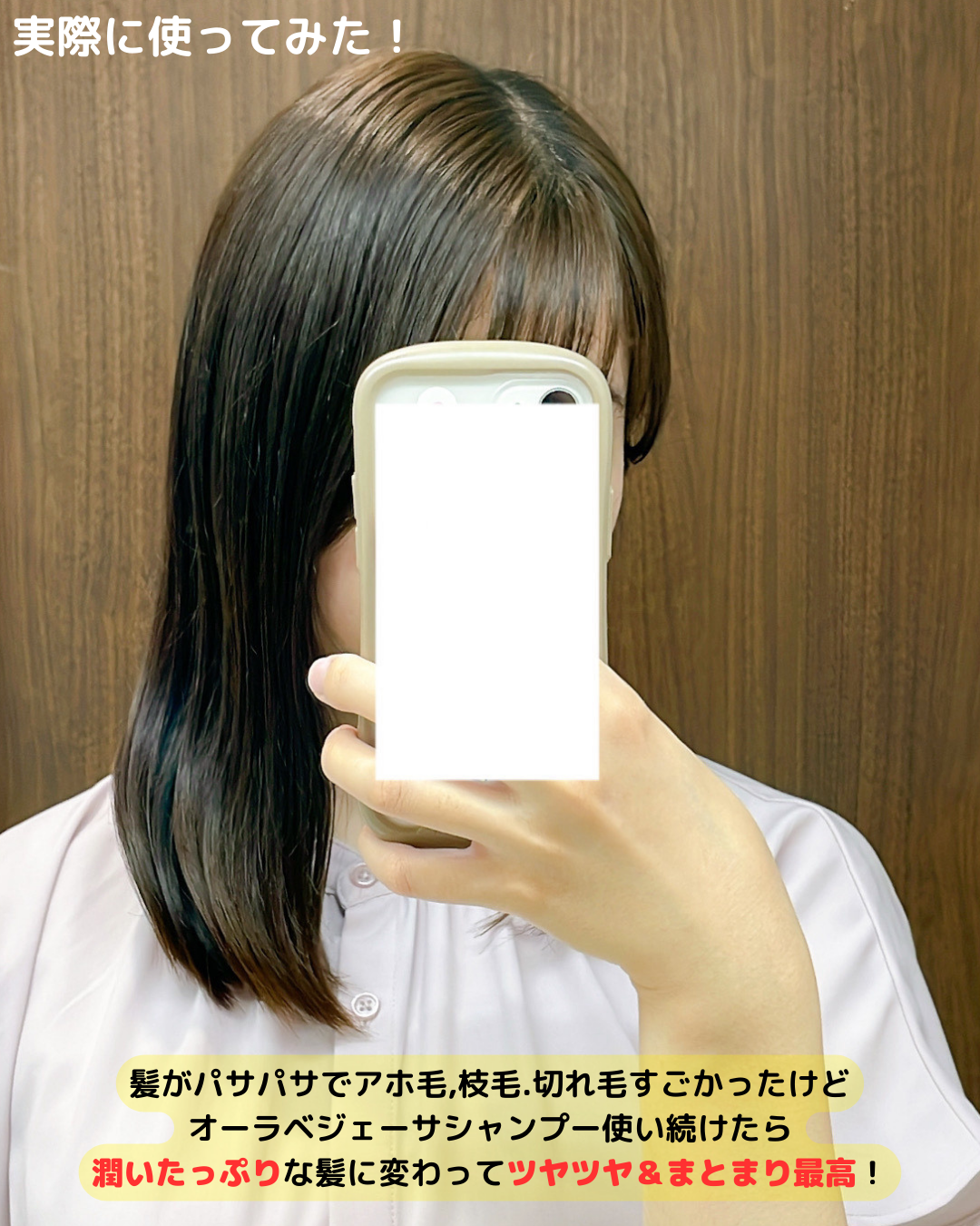 今まで髪がパサパサでアホ毛,枝毛.切れ毛すごかったけどオーラベジェーサシャンプー使い続けたらキューティクルが開かずまとまってきたのか髪全体のまとまりが良くなるだけでなく、写真からも分かるようにツヤッとした潤い髪になった!