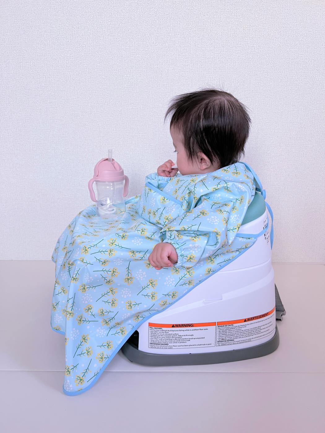 このお食事エプロンはお洋服と机全体をすっぽり覆えるので、服も机も汚れず、今までの悩みを解決してくれました.ᐟ.ᐟ