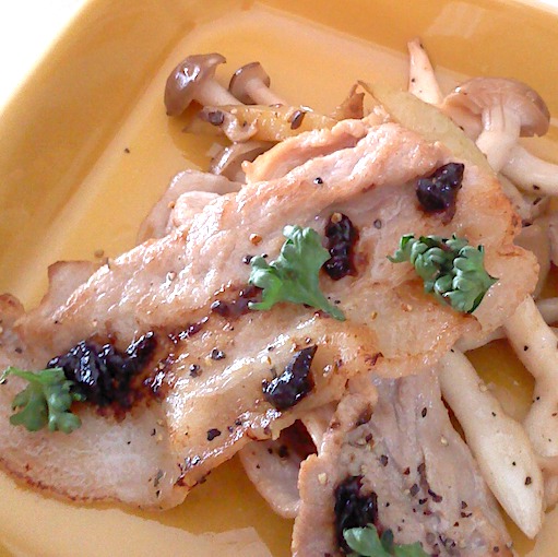 で、塩コショーでパリッと焼いた豚肉に添えてみました。