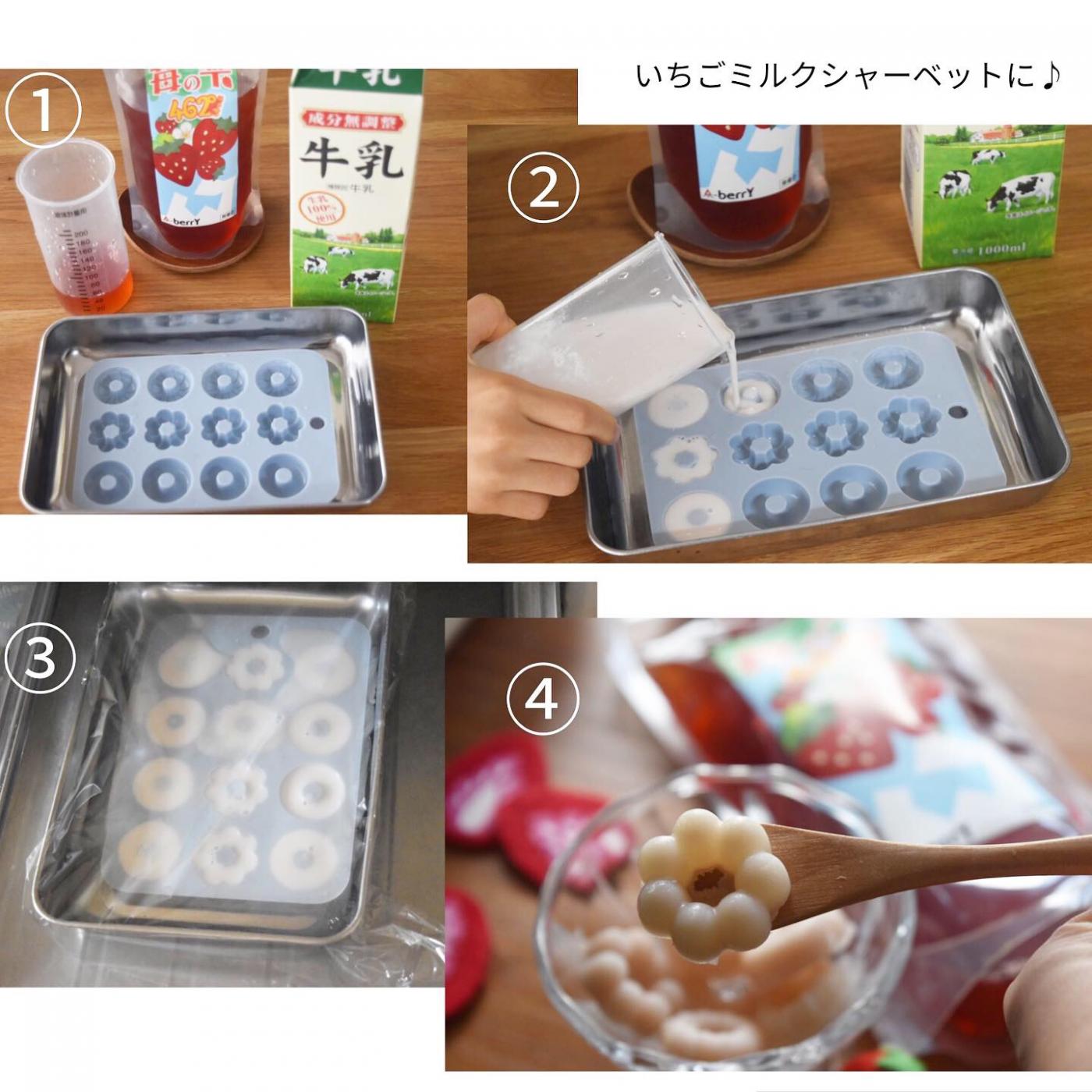 シャーベットは、牛乳80㏄に対してシロップ35㏄を混ぜたものを型に注ぎ、冷凍庫で凍らせるだけです♪