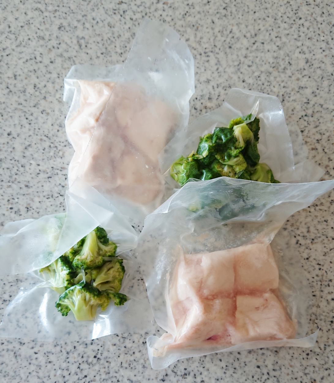2つの袋の中には、それぞれ真空パックになった鶏むね肉とブロッコリーが2袋ずつ入っているので、計4袋です。