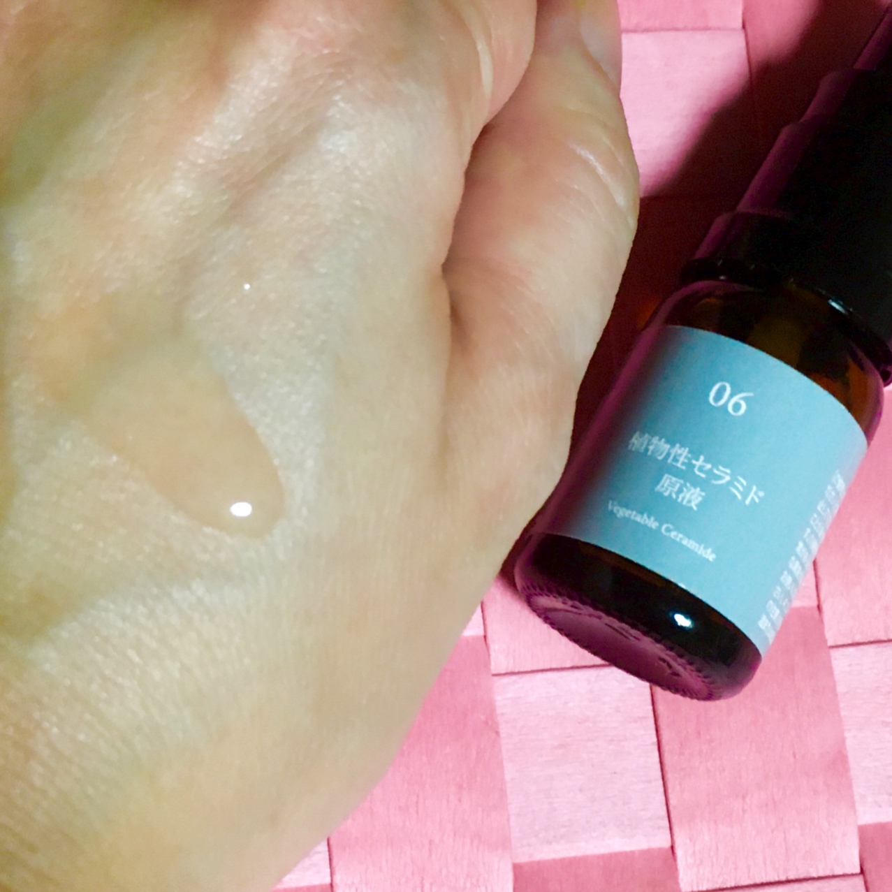 ⑥植物性セラミド原液を使ってみたところ、乳液より透明でさらっとしたテクスチャー、においは感じず、化粧水よりはねっとりとしていて、お肌にぐんぐん吸い込まれる感じでした。