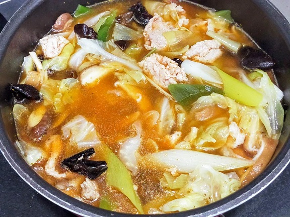 白菜とかチンゲン菜が合うみたいですが、冷蔵庫になかったので葉物はキャベツで(笑)