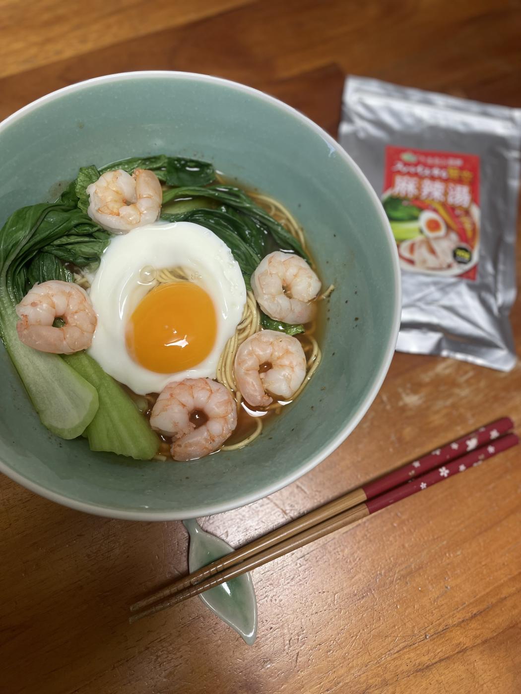 あとは、普通に麺でエビと青梗菜と卵をのせたり、豚バラと青梗菜と卵をのせたり…。