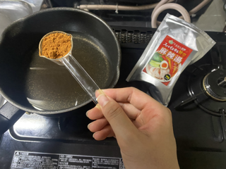 銀色の袋に入った麻辣担のもとは、袋を開けてみると辛いような甘いようななんだか不思議な匂いがしました。