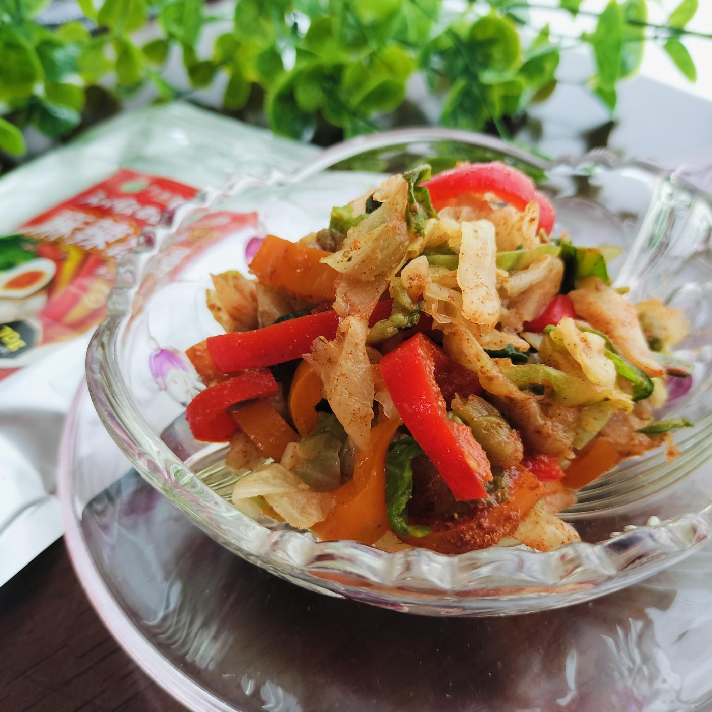湯通しして水気を絞ったキャベツやパプリカに、麻辣湯を加えて混ぜ合わせただけ♪