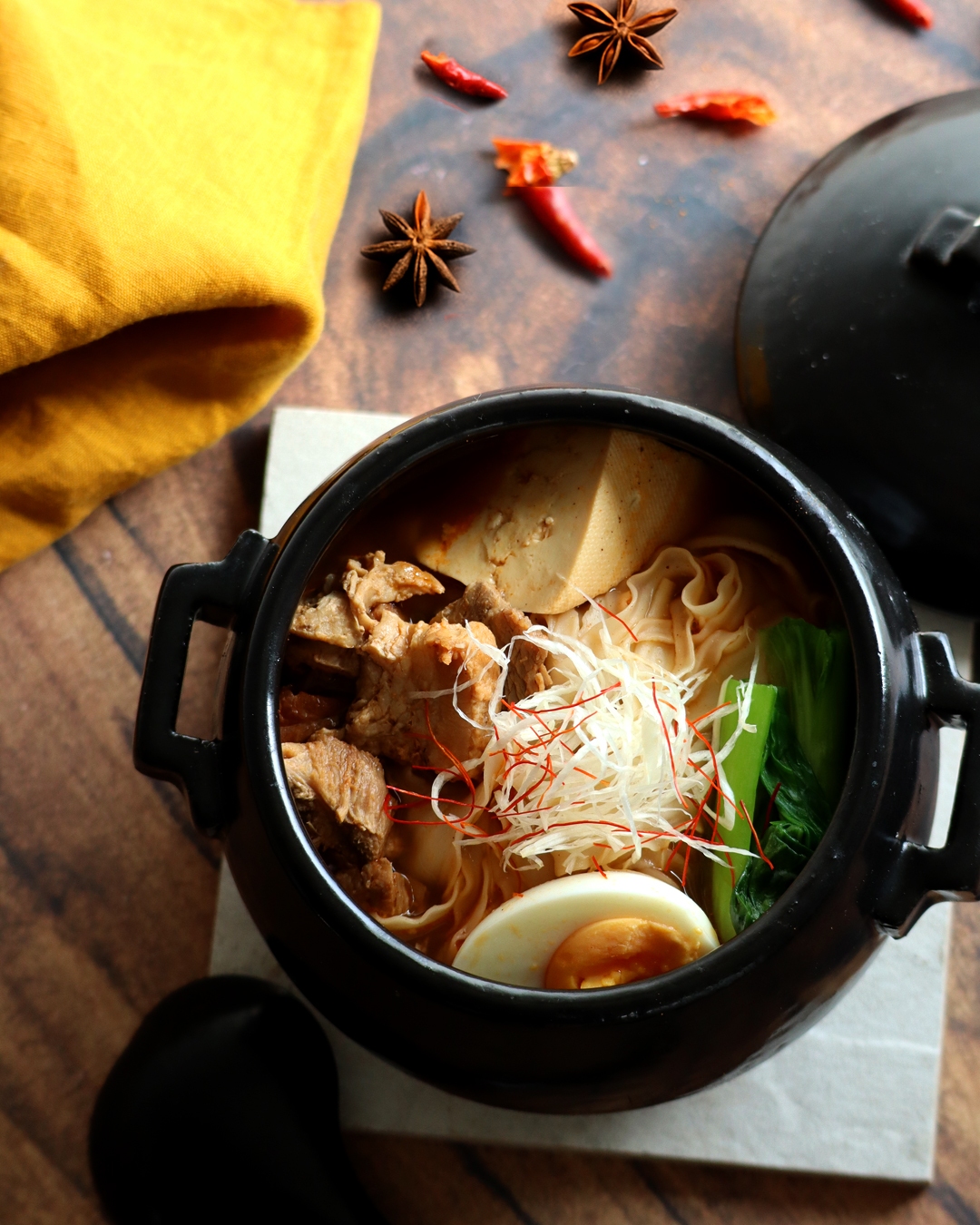 香港で食べたものは、米線(ミーシェン)というお米の麺を使っていましたが、今回はおうちにあった乾燥の刀削麺と具材、ラー油を用意して作ってみました🍜