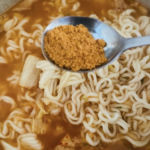 開けてみるといかにも辛そうな唐辛子カラーのパウダー。かなり辛そうに見えたのでまずは1人前のラーメンにスプーン1杯からお試し。