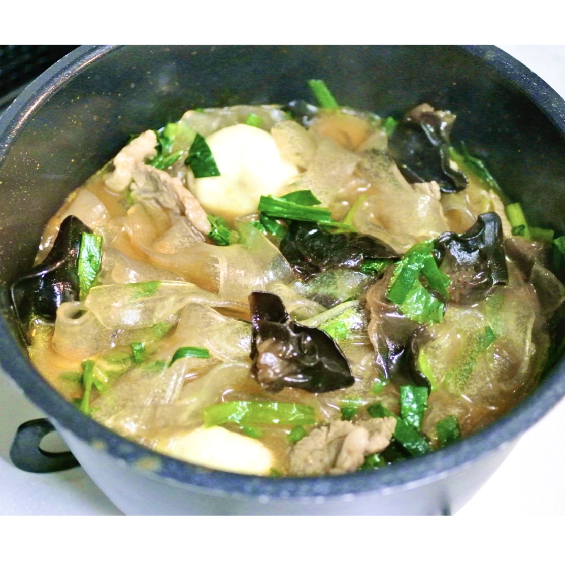 板春雨、青梗菜、木耳、蟹団子、豚肉を用意し、自分の好きな具材をたっぷりいれて煮込み、簡単に本格的な麻辣湯を作ることができました。