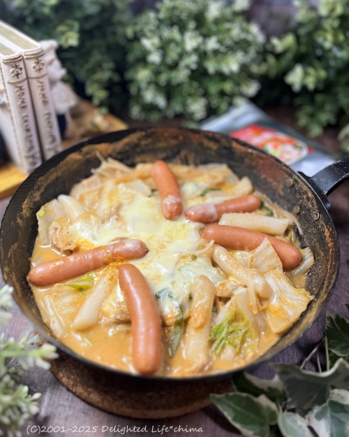 お鍋にお水と牛乳を100mlそれぞれ100mlを入れ、<うるわし茶房 スパイス香る 旨辛 麻辣湯>大さじ1程度加えたらたら冷蔵庫・冷凍庫にあるもの適当に入れて煮込み、仕上げにチーズをトッピングしました。