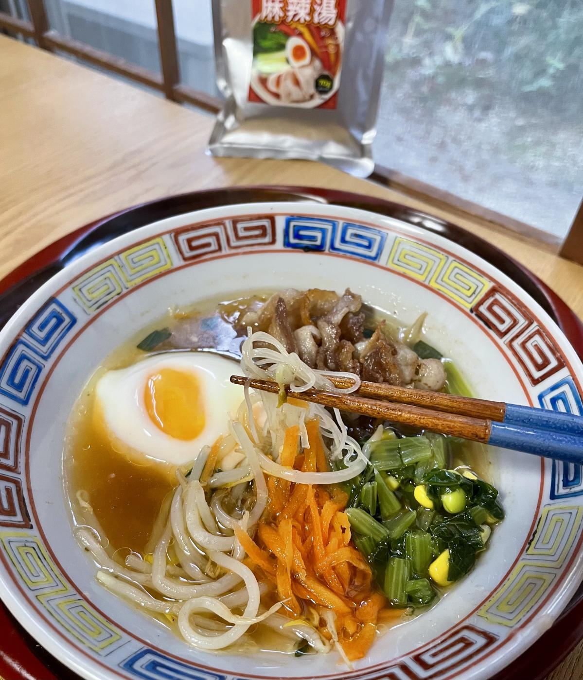 今回はもやしとにんじん、小松菜などの野菜と豚バラと春雨を入れました。上にはレンジで作った温泉卵も乗っけて。