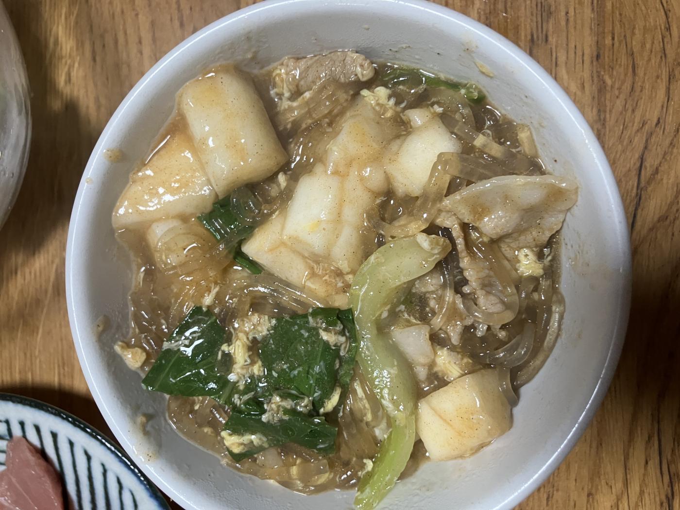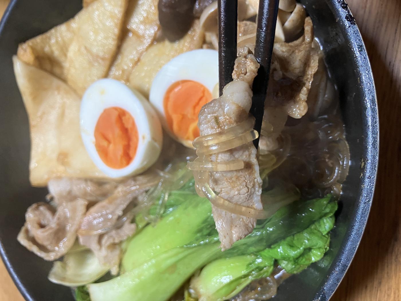 我が家の初麻辣湯は豚バラ肉、青梗菜、揚げ、白はんぺん、きのこ2種類に春雨で作りました。