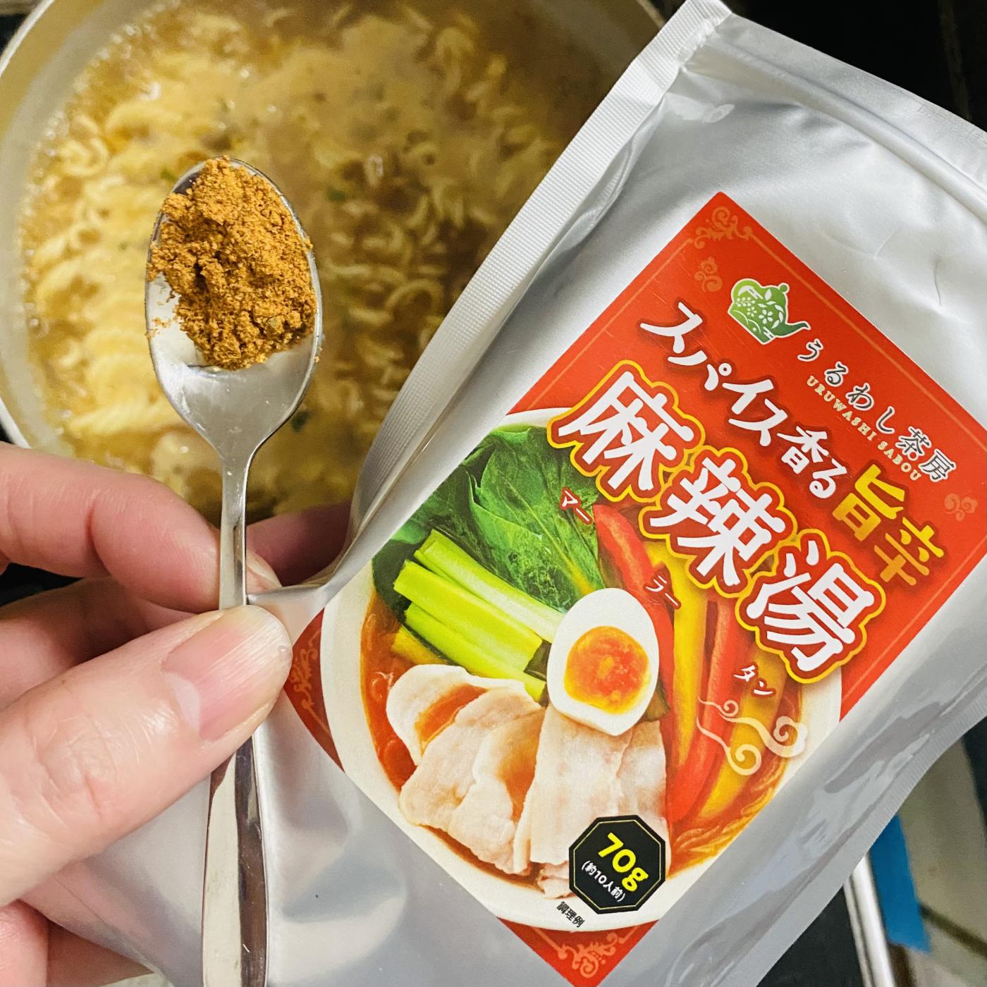 味の特徴は、唐辛子や花椒の辛さと痺れがクセにらなる味わい。スパイスはなんと11種類と本格的なんです。サラサラとしたパウダーなので仕上げにさっとプラスして煮込めばちょい辛ラーメンの出来上がり。パウダーはスープにさっと溶けてくれるので手間要らず。