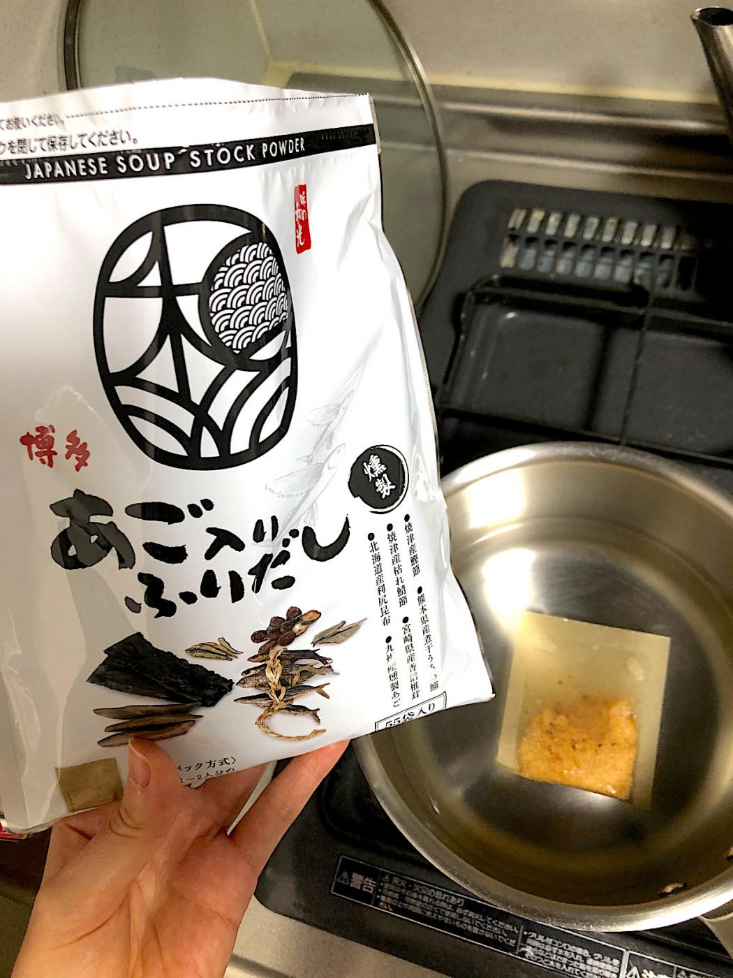 お水に出汁パックを入れて、沸騰してから2分くらい煮出すだけ。