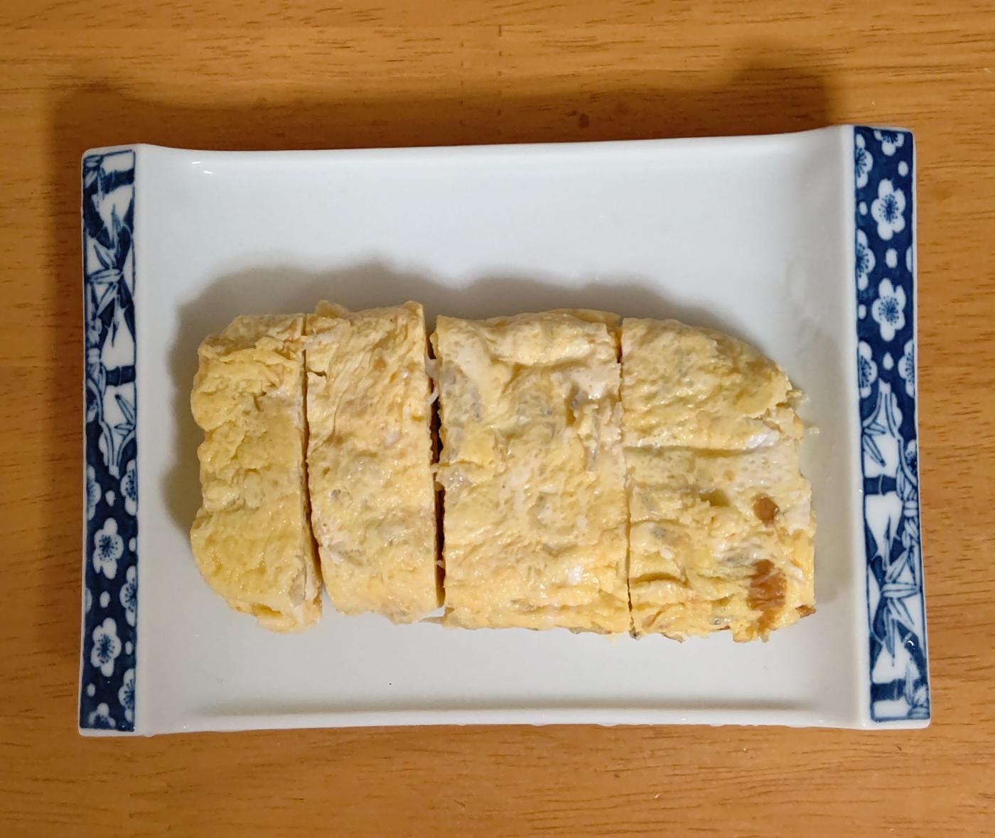 まず、じゃこがあったので、卵2個分と味の和光の博多あご入りふりだしで取ったおだしでだし巻き卵を作りました